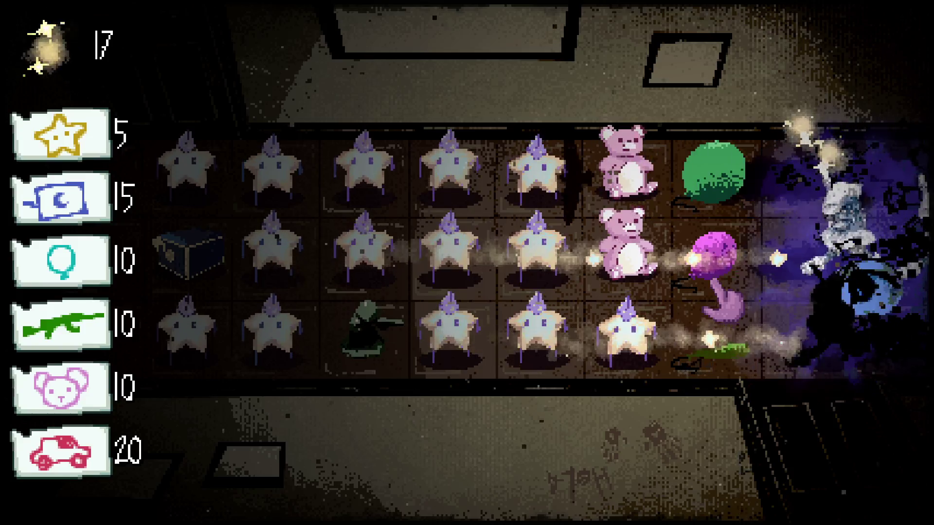 Oh and the art, GOD THE ART!!!!! I love mixed media and it's used amazingly here! The bitcrushed real photos mixed with the cute-sy sprites of the toys really are an amazing contrast, and add to this game's horror. Speaking of, the atmosphere of this game actually had me terrified, which I found surprising. The sound design and the game's use of like darkness and stuff, plus all horror the art style brings, make for a REALLY creepy little game. I especially like how long it takes to game over, with the nightmare creatures having to go ALLL the way to the end of the screen despite having already past your defences. It was SO tense, I didn't know what was going to happen!! Thank God there are no jumpscares though. Not just because their cheap but because they would've gotten me SO good, thank you for your mercy I guess lol.